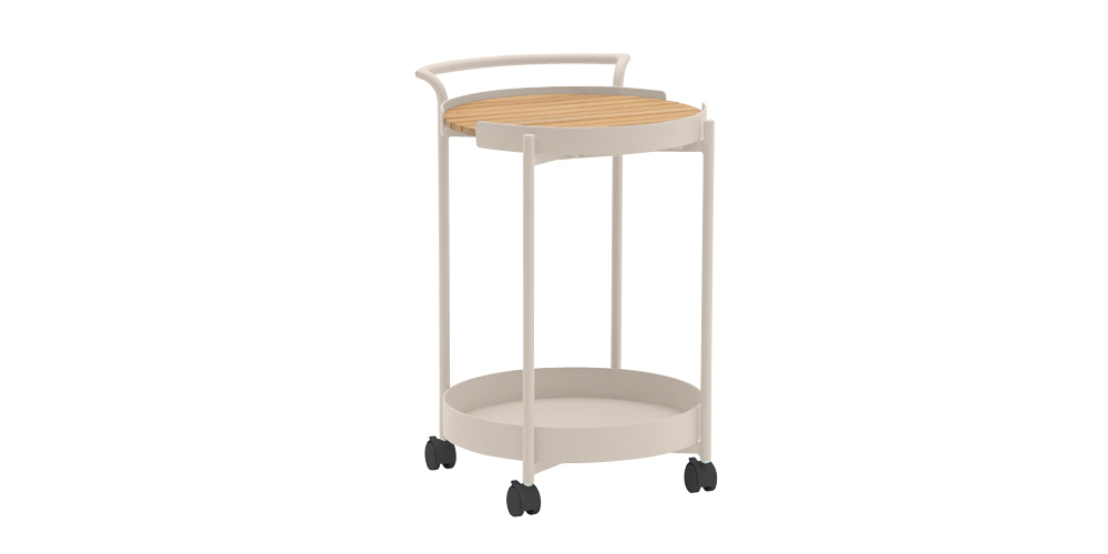Step up your hosting game this summer with our Leto Outdoor Small Round Drinks Trolley, the ultimate accessory for your outdoor gathering. Whether you're mixing cocktails on the deck or serving a platter next to the pool, the Leto trolley is here to impress. Crafted from durable powder coated aluminium with a natural teak tabletop, this trolley is built to withstand the hustle and bustle of the summer season. With two convenient serving levels, you'll have plenty of space for all your summer essentials. The sturdy lower shelf is also perfect for extra bottles, glasses, or snacks. The lockable caster wheels make it a breeze to roll the trolley wherever the party goes, indoors or out and the stylish teak top also doubles as a removable serving tray – talk about versatility!
