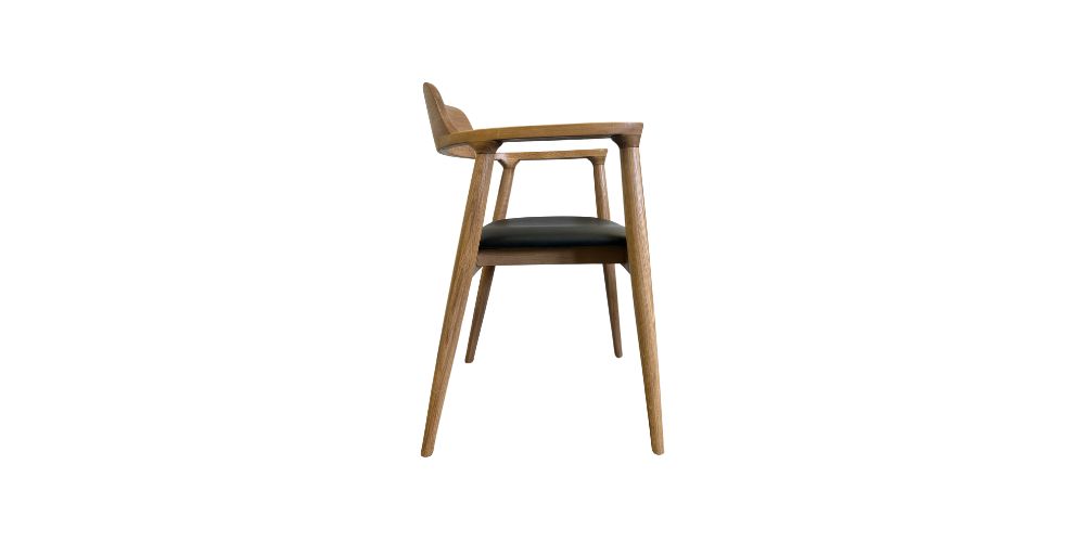Crafted from solid natural oak and oak veneer, our Sloane Dining Chair with Arms, showcases simplicity in its finest form. Effortlessly designed with a refined silhouette, featuring distinctive soft curves and splayed, tapered oak legs complete with a warm, natural oak stain, offers an understated mid-century inspired aesthetic. A padded black PU seat cushion adds comfort and contrast, enhancing the bar stool’s clean, timeless appeal.